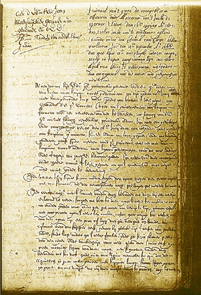 Our people asked him for his name, from what country he came and how he had come there. He answered thus: "My name is Jan Janse Weltevree from De Rijp. I came in 1626 with the ship Hollandia from the fatherland and in 1626, while going to Iapan with the jaght Ouwerkerck, due to the unfavorable wind, we stranded at the coast of Coree. We needed water and we went with the boat ashore, where three of us we captured by the inhabitants. The boat with the remaining companions got away and the ship left immediately." He said furthermore that his two companions were killed after 17 or 18 year, when the Tartar came into the country, were killed. They were (called) Dirk Gijsbertsz from De Rijp and Jan Pieterse Verbaest from Amsterdam.