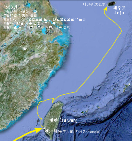 1653년 6월 18일 인도 총독과 평의회의 지시로 우리는 스뻬르베르호(the Sperwer hawk)를 타고 자카르타(Batavia)에서 대만(Taijoan)으로 항해했다. 해임된 니꼴라스 베르베흐경의 후임인 대만총독 꼬르넬리스 께이사르경이 승선해 있었다.