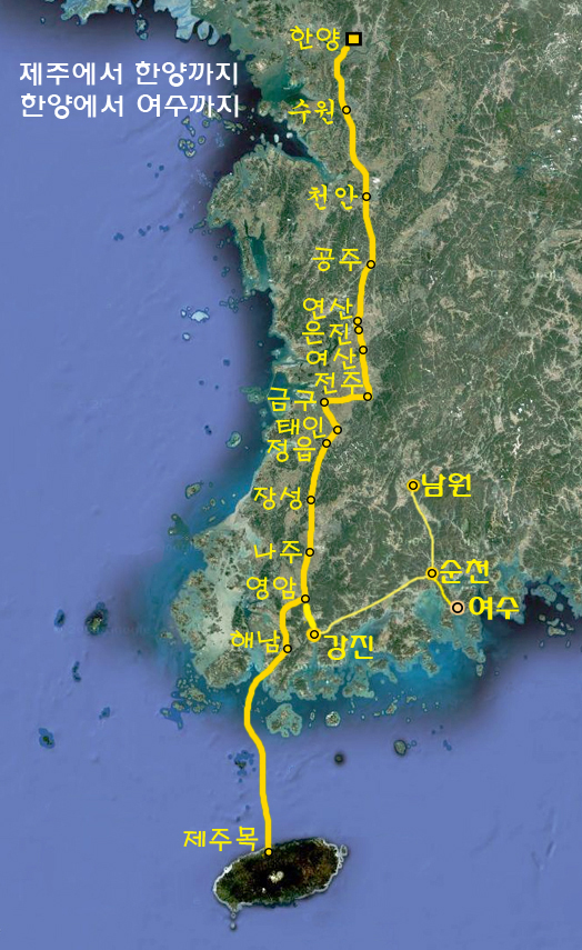 다음 날 다시 이동해서 밤에는 장성에서 머물고, 다시 아침에 떠나서 그날 크게 보강해서 쌓은 입암산성이라는 높은 성을 지나서 정읍에서 체류했다. 정읍에서 숙박한 후 아침에 떠나 같은 날 태인에 도착했다. 이튿날 아침 말을 타고 떠나서 오후에 금구라는 작은 도시에 도착해서 점심을 먹은 후에 다시 길을 나서 고대에 왕이 궁궐을 지었으며 전라도 관찰사가 주재하고 있는 전주라는 큰 도시에 밤이 되어 도착했다. 이 도시는 전국적인 큰 상업 중심지로 중요하며, 해상으로는 접근할 수 없는 내륙에 있다. 다음 날 아침 다시 말을 타고 전라도 지방의 마지막 도시인 여산에 밤에 당도했다. 충청도 지방에 있는 은진이라는 작은 도시에서 머물렀으며, 다음날 연산으로 향해 밤에 머물고 다음 날 아침 다시 말을 달렸다. 밤에 충청도 관찰사가 있는 공주에 도착했고 다음 날에는 큰 강을 건너서 왕도가 있는 경기도에 들어 섰다.