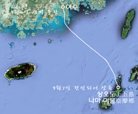 판관 노정이 소주(arrack)를 한 잔씩 따라주고 그들을 천막으로 돌려 보냈다. 곧바로 그들은 와서 무엇을 먹는지 천막 안을 살폈지만 고기와 베이컨이 절반쯤 찬 두 통 뿐이었고, 그들은 그것을 즉시 판관 노정에게 보였다. 한 시간 정도 후에 작은 분량으로 나눈 쌀밥을 가져왔다. 그들은 우리가 배고플 것이고 (한 번에) 많은 양은 아마도 우리를 해치게 할 것이라고 생각했다. 정오가 지나 밧줄을 든 무리들이 나타나자, 우리를 묶고나서 죽일 것이라는 생각이 들었기 때문에 너무나 소스라치게 섬뜩했다. 하지만 그들은 부산한 소리를 내며 아직 쓸만한 물건들을 가져오기 위해 난파선으로 갔다. 밤이 되자 그들은 먹으라고 쌀을 조금 주었다. 정오 무렵 키잡이는 위도를 측정해 위도 33도 32분에 위치한 제주도에 있다는 것을 알아냈다.